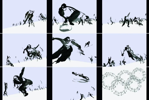 作品运用3DMax数字技术将宣纸上二维水墨形态的冬奥运动人物进行动态化、多媒体化,展现在冰雪严寒中人类“更干净、更人性、更团结”的冰清玉洁的生命之光。