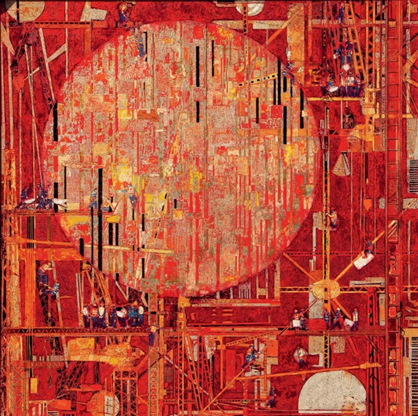 作品表现抗疫方舱医院热火朝天的建设场景,平面化的处理和外方内圆的构图极具形式美感,强烈主观的赋色充满能量,体现中国速度与抗疫精神。