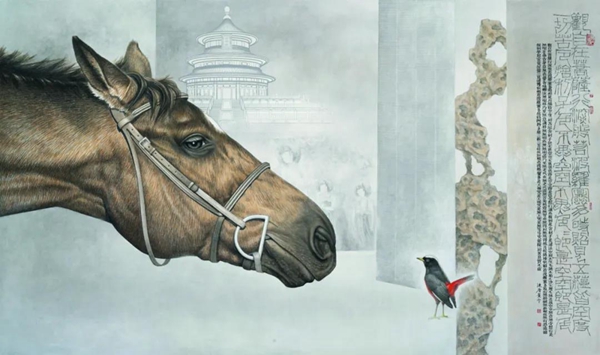 以中国传统笔墨描绘祈年殿前“马”与“鸟”的对语,体现的是世界上的精彩与坎坷非人类独享独遇。通过追问生命的价值与尊严,使天下万物同一共进,创造未来。