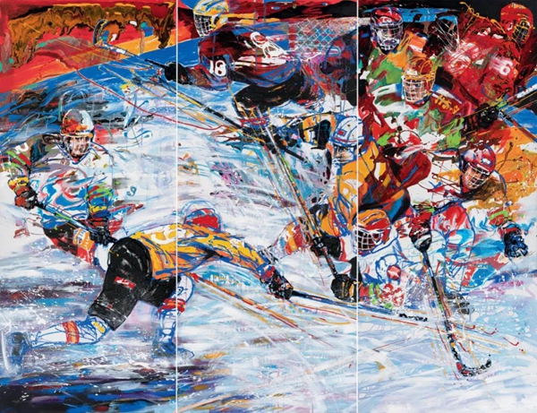 奥林匹克是人类精神文明的竞技光辉,是强身健体的民族之魂,生命在于运动,运动促强身。冬奥在北京举办让人振奋,冰雪的碰撞所产生的是一种能量,这幅作品以“顽强拼搏,团队合作”的冰球文化为主题,弘扬奥林匹克精神。