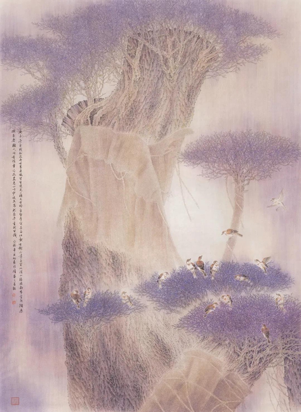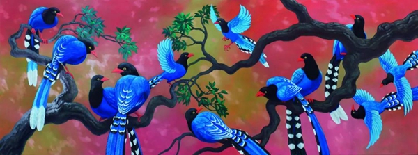 画家以工笔重彩,细腻地描摹出台湾蓝鹊的身形与精神。枝头上凝神远望的鸟儿,昂首自足、高贵傲然;或是对话中的鸟儿,眼神里流露出刚强性情;或是共舞中的鸟儿,展翅漫舞各自陶醉。饱满鲜丽的蓝色羽翼,赤红的鸟喙、黑黝的头颈;优雅典丽的色泽,在如同殷玉如翠背景的映衬下,众蓝鹊群聚一起欢舞跳跃就像一群散播欢乐的人。