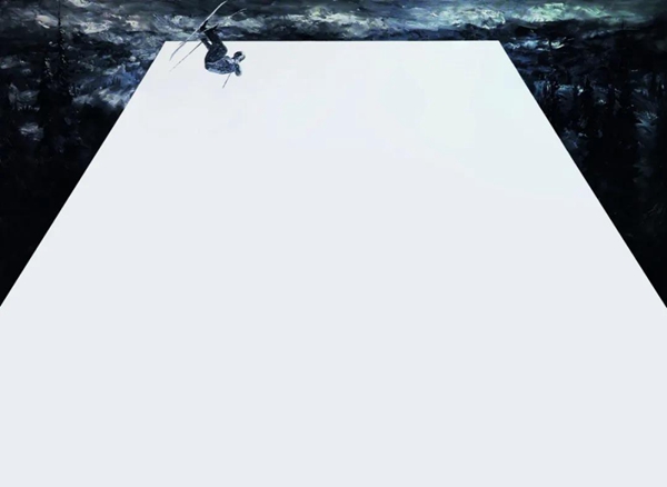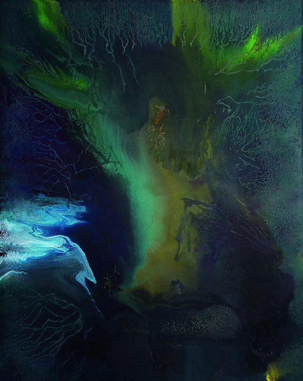 作品立意取自唐代杜甫的《登楼》。冬末春初大地混沌,一粒小小的种子从墨黑的地下伸出头来,努力的生长、呼唤着,企图叫醒大地。江翠、天蓝的油彩从黑墨的爪痕中渐递的晕染泼洒,宛若杜甫诗中的古往今来的惆怅。