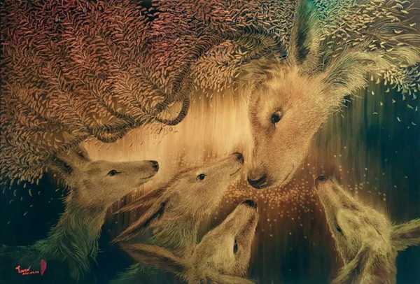 中华民族好善,崇善如流,鹿乃自古以来之祥兽,鹿与禄同音,有敦睦相亲共享共荣之意。本作品巨鹿的犄角化作富产的森林,庇佑小鹿足食无虞,慈目低首殷殷叮咛,小鹿聚首凝望;印证生活价值、体现生命光辉,如抗疫英雄救人,军人医护无私奉献,人民团结一心……就像奥运精神般永不放弃,如妈妈的叮嘱,爱永不止息,心永不分离。