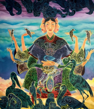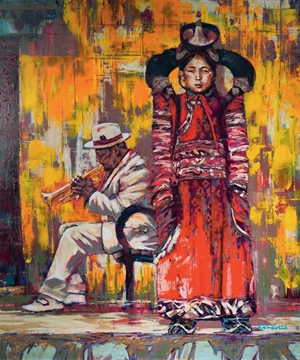 作者以表现蒙古的游牧生活、独特风俗和文化传统见长。在这幅布面油画中,创作者运用油画特有的醇美笔调,描摹了自己对神秘图像的理解。他还应用了新的绘画技巧,创造了独特的风格,赋予日渐式微的蒙古传统游牧生活和历史文化一种全新的活力。