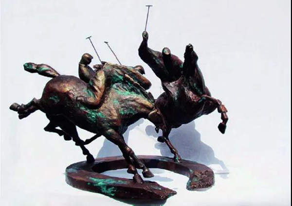 在马蹄形底座上塑造高起、平直、下冲三个马球动作,从各个角度看都有一种空间的重叠关系,作品轮廓线借用传统中国画的审美标准,强调完整统一,人腿做虚化连接的处理,达到人马合一的效果。