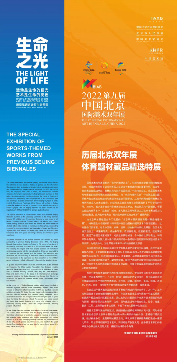 由北京双年展组委会专门设置的“北京双年展历届体育题材藏品精选特展”,特别遴选16个国家的32件表现体育运动题材的国际艺术作品专题展出。这些作品门类丰富,包含中国画、油画、版画、综合材料绘画以及雕塑。在艺术风格及语言上,或逼真写实,或抽象写意,或细腻唯美,或轻松诙谐,或充满哲思,展现了各国艺术家对体育、对奥运极具地域性、个体性的认识与表达,和而不同各美其美,与第九届入选作品共同打造一条跨越时空的国际体育题材美术作品长廊,为冬奥助力,为世界观众带来不一样的独特视觉享受。