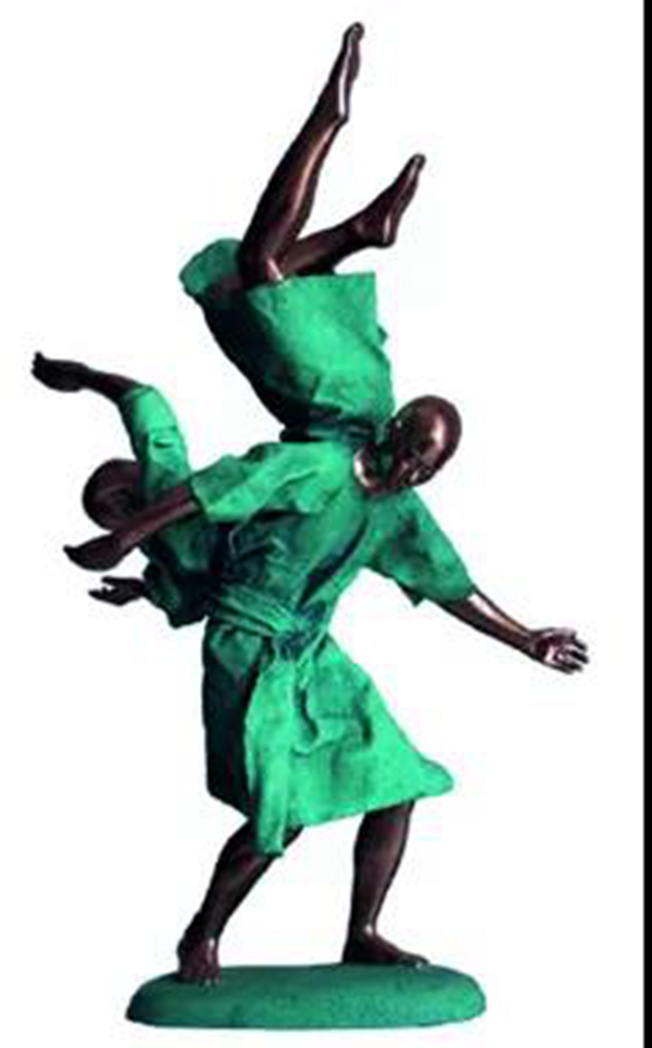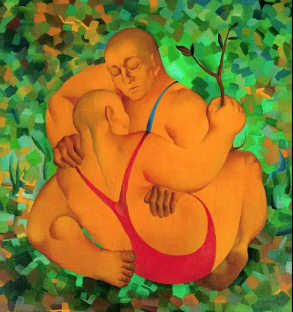 表现两名胶着缠斗的摔跤手,人物造型高度风格化,肢体动作夸张,表现摔跤运动中竞争与友谊并存的状态。