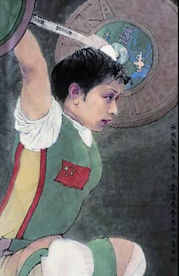 作品选用举重运动员、奥运金牌获得者杨霞擎举夺冠的瞬间作为画面主体,表现概括、简洁,不过多追求立体感,使之保持在两维半空间,符合东方的审美习惯。