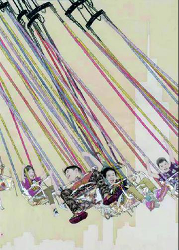 作品灵感来源于现实生活中的游乐场,主要表现现代儿童欢乐的童年。画面中人物及背景的处理单纯明朗,在继承传统工笔写意的基础上敢于突破,运用了独特的现代艺术表现手法和新材料,着重表现服饰的质感和肌理,使画面更具表现力。