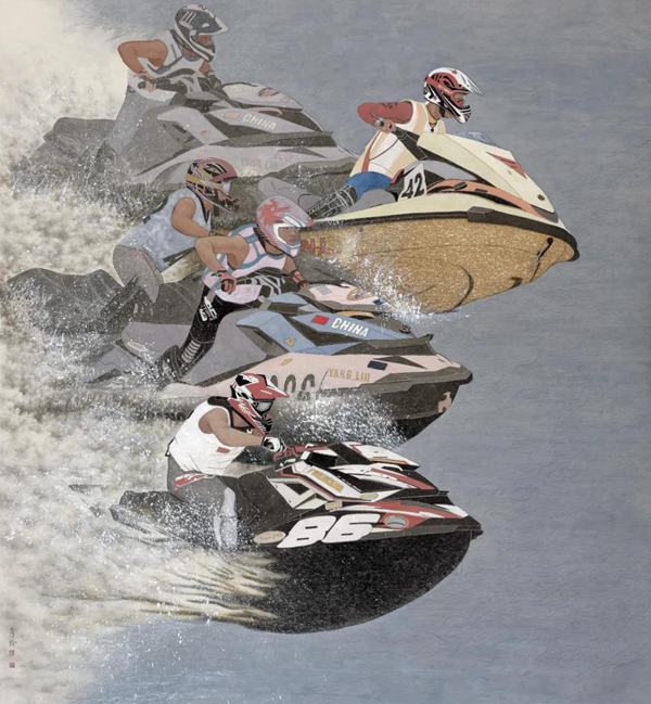 作品表现的是深圳市大梅沙国际摩托艇比赛,画面中着重表现了摩托艇在海上运动比赛的激情场景,整体运用了“莫兰迪”式的灰色调。作者生活在海边,常能看到各种海上运动,给她印象最深的还是摩托艇,全速挺进的摩托艇最能代表这个时代奋进的激情与速度。