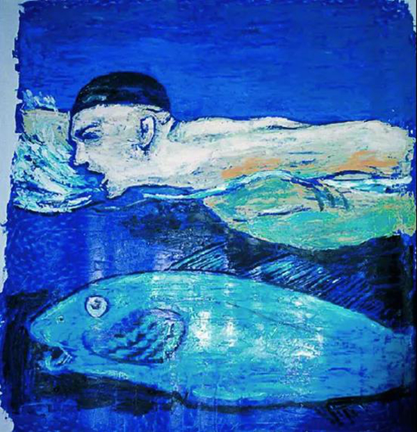 用充满童趣的稚拙笔触描绘人鱼同游的幻想画面,表达生命和谐相处的美好愿望。