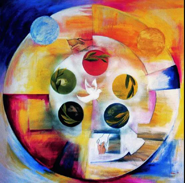 这个世界由难以计数的符号组成。我们有很多的方式来表达生活的多彩。在作者看来,最重要的就是精神本身。这幅作品用圆环和丰姿绰约的女人体来展现和谐,也许世界并不完美,但我们要一直为此奋斗。