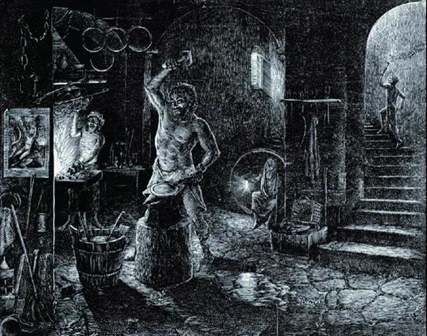 用经典的黑白木刻语言,描绘铸造奥运五环标志和奥运火炬传递等场景,将火发光发热的特性与奥林匹克精神联系在一起。