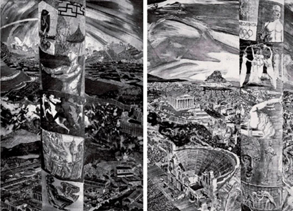 将雅典奥运会与北京奥运会两幅幻想的画面并列组合在一起。在圆柱和背景上刻画了希腊雕刻、瓶画、神庙、竞技场与中国长城、故宫、园林、体育场等众多图像,将历史与现实、东方文化与西方文化交相融合,赋予人们跨越百年的丰富联想。