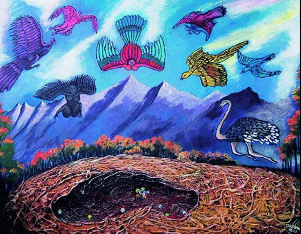 作品属超现实主义风格。作者以拟人的手法来表现鸟类。它们传递着爱情、和平、安宁、友谊、神圣及对每个人的希望。