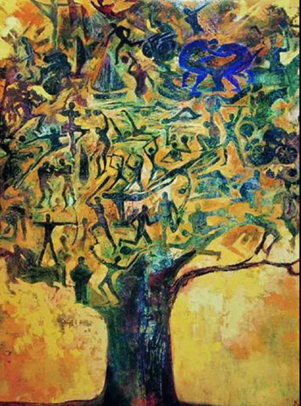 这是力量、勇气、耐性的象征。根基的深度决定着枝叶的成长。通过体育与文化来诠释奥林匹亚精神,即双年展的主题。于是作者以生命之树作为元素来表现作品,实现生命的目标、成就与人类自身。