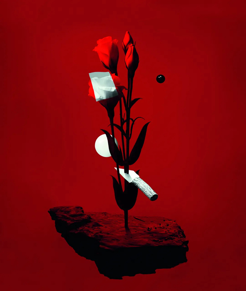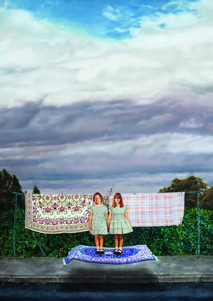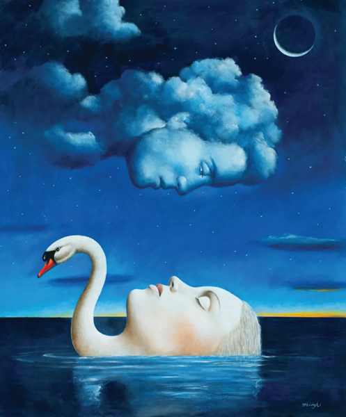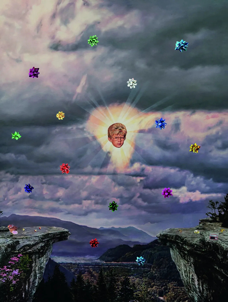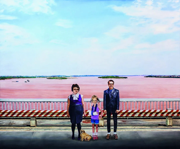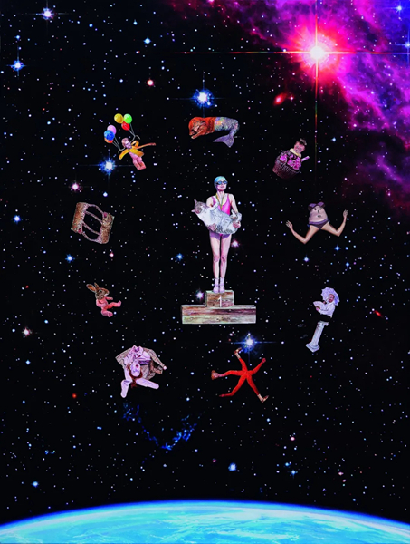 作者在艺术实践中,将绘画(作为一种传统媒介)与当代流行文化的意象和数字时代视觉语言的新形式融合成一体。作者一开始运用了云端的拼贴画步骤,通过数字操作、组装拼贴到最后呈现出油画这一传统媒介,创造了复杂的视觉隐喻场景。