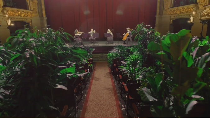 这个视频创作于西班牙因新冠疫情而封城期间,没人能去电影院、剧场等地。艺术家利用这段时间“邀请”无数植物来聆听巴塞罗那大剧院的现场音乐会。植物粉丝们座次有序,就像普通观众一样随着音乐轻轻晃动、陶醉其中。