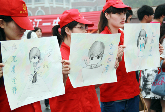 6月7日,2012年全国高考江苏省镇江市第一中学考点外,江苏大学的大学生志愿者手持漫画和标语,为考生加油鼓励。当日是2012年全国高考第一天,共有约915万名考生报名参加考试。新华社发 杨雨 摄