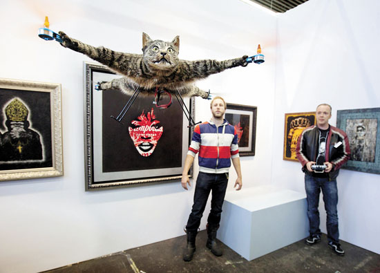 一只“会飞的猫”近日亮相在荷兰首都阿姆斯特丹举行的艺术节。这是艺术家巴尔特·扬森(左)和无线电直升机航模专家阿尔延·贝尔特曼联手完成的作品“奥维尔直升机”。扬森介绍说,自己的爱猫“奥维尔”在一场车祸中不幸命陨,于是便制作了这个标本艺术品,向逝去的爱猫致敬。