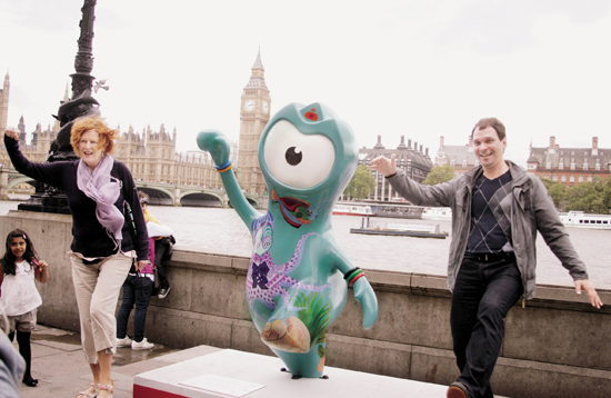 7月18日,游人与奥运会吉祥物文洛克雕像合影。近日,伦敦奥运会吉祥物文洛克雕像现身伦敦街头,可爱的形象吸引了很多游人驻足合影。新华社发 高塔姆 摄