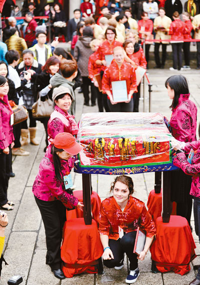 12月9日,成年礼生绫(钻)桌脚。当日,国际扶轮社第3520地区、3490地区在台北孔庙大成殿广场举行“国际成年礼”,130名成年礼生由来自18个国家和地区的交换学生、小区及弱势团体青少年组成,全程依循古礼着唐装、进行绫桌脚、戴冠及笄等仪式,象征青年之成长与蜕变,令外国学生感受中国儒学文化之美。 新华社发 吴景腾 摄