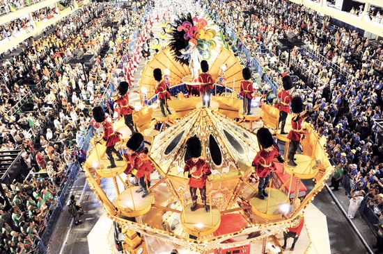 2月20日,里约热内卢狂欢节特级组桑巴巡游表演进入第二天。各家桑巴学校以彩车、桑巴女王和盛装方阵登场,在镜像对称的桑巴大道上制造出梦幻景观。图为Ilha桑巴学校的演员在巴西里约热内卢桑巴大道上表演。