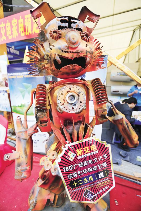 4月3日至17日,2012广场家电文化节在江苏省无锡市举行。来自浙江省嘉兴市的铁艺秀团队现场展示了20件铁艺作品,在传播现代艺术的同时,也倡导一种环保创意的理念。图为铁艺作品“虎”。新华社发