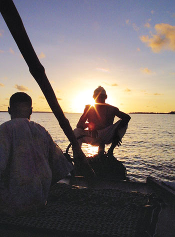 肯尼亚沿海拉穆群岛拉穆镇的渔民在自己的渔船上观看日出。来自欧洲的大型商业渔船及其使用的现代化捕鱼设备正在造成肯尼亚沿海海洋生态的严重破坏,威胁肯尼亚的渔业资源。哥伦比亚大学地球研究所主任杰弗里·萨克斯说:人口增长正在消灭动物的多样性,同时我们消耗的许多资源都是不可再生的。新华社记者 费茂华 摄