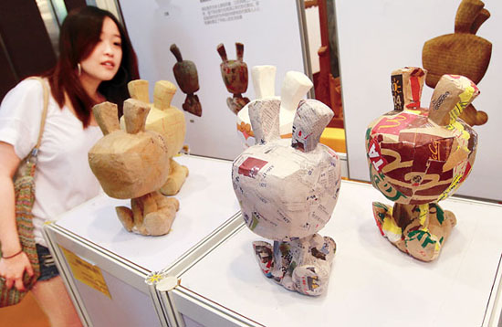 观众在近日举行的2011上海设计展上参观用废纸制成的卡通储钱罐。新华社记者 裴鑫 摄