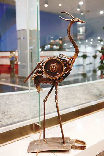 北京汽车博物馆中,用废旧汽车零件和工具做成的雕塑生动有趣。本报记者 康伟 摄