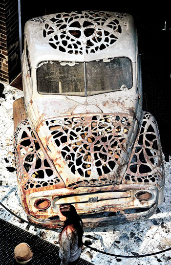 澳大利亚名为“爱蕾丝”的当代蕾丝艺术展上,艺术家英格丽德·莫利借助等离子切割机在一辆废旧农用卡车手工切割出蕾丝花纹。新华社/法新