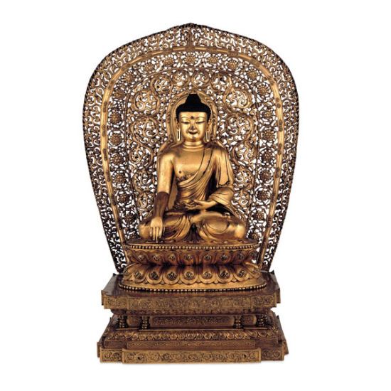 这尊历史著名的释迦牟尼佛像,复杂的设计和金属铸造工艺,彰显中原佛教和藏传佛教的融合。它是现存的15世纪早期最大、最华丽的中藏佛教风格的青铜器之一。这尊青铜像分三部分铸造:佛像和双层莲花座、矩形阶梯式基座以及图案为火焰和缠枝花纹的椭圆光轮背景。佛像的姿势表明着释迦牟尼抵挡住诱惑,获得了安宁和真理。