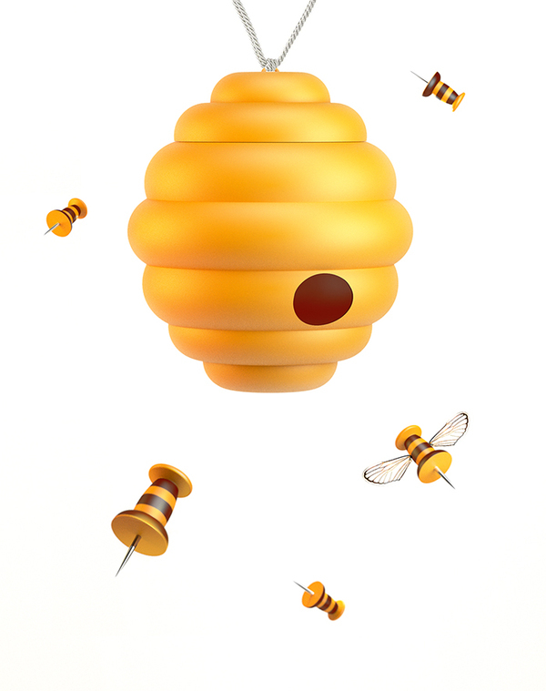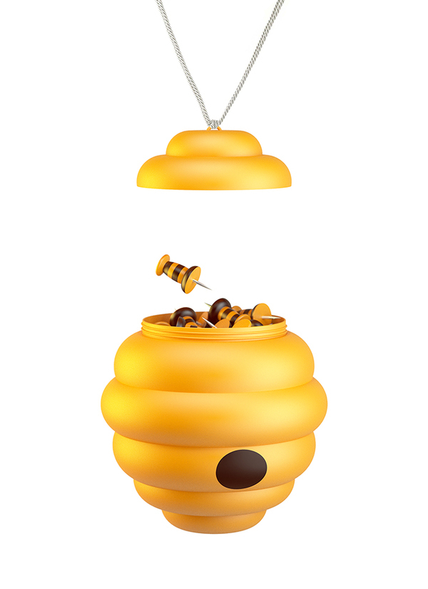 这套大头针组合很有趣,整体做成蜂巢与蜜蜂的样子,蜂巢用来储存不用的或者多余的大头针;大头针的尾部设计成蜜蜂的条纹状,加上大头针本身尖尖的头,活脱脱一小蜜蜂。
