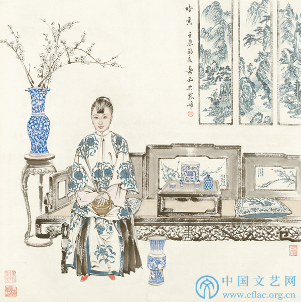 我也喜欢古董,平时收藏一些市场价值不高的清代、民国时期的物件,包括瓷器、铜器。这其中,对我吸引力最大的是青花瓷。偶然一次,我把青花瓷放在红木案几上,白色的底上覆盖着亮蓝色的花纹,恍惚之中,我仿佛看到青花瓷就像一个古典美人立于案几之上,造型婀娜多姿,又极素雅,漂亮极了,后来我就用青花瓷为题材创作了一张画。上世纪80年代初,香港人经常在内地买画、办画展。我的这幅画被展在香港人办的画展上,别人告诉我,我的这幅画在画展中最抢眼、最受人瞩目,画展开幕第一天就被人买走了。有人建议我多画一点“青花”系列,我也开始思考,青花瓷的确是一个很好的素材,但是一开始并不知道该如何画下去,总不能一直画一个或几个青花瓷瓶放在案几上。后来我就想把青花瓷同中国的风俗、中国的文明和情怀结合起来表现,这样题材就拓展开了,一下构思出近100张画,于是就开始了“青花”系列的创作。