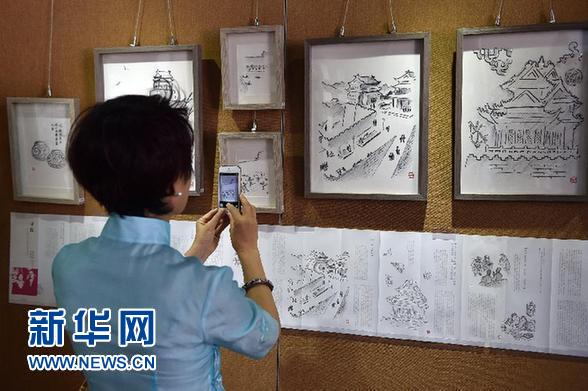 5月18日,参观者在展览上拍摄李滨声绘画作品。当日,为期一月的“追寻北京的记忆”李滨声绘画作品展在北京西城区什刹海烟袋斜街广福观内拉开帷幕。 新华社记者 李鑫 摄