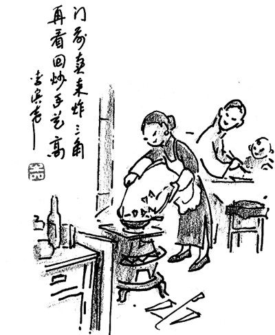 李滨声漫画北京民俗小吃《炸三角》(转自光明日报)