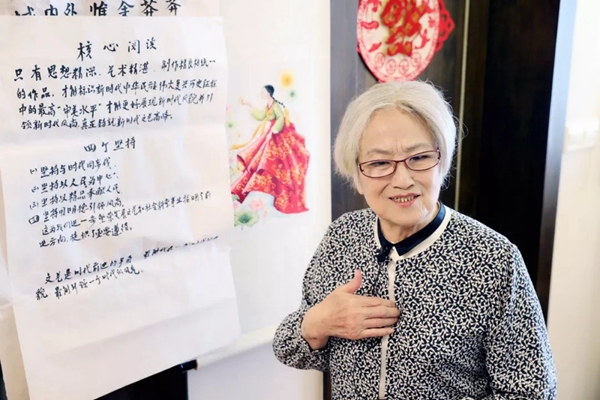 在王老师家卧室的门口处,挂着一张很大的纸,是她用毛笔写的“核心阅读”,内容是习近平总书记关于优秀作品的指示,“写在纸上,记在心上。每天走过都可以读一读”。王老师认真地说:“我们要努力创作思想精深、艺术精湛、制作精良的‘三精’作品。这一点,过去、现在、将来都将永远是文艺人不变的‘初心’,永远的使命。越剧是草根文化,它的特性就是从群众中来,到群众中去。所以我们要始终扎根人民群众,为人民大众服务。”