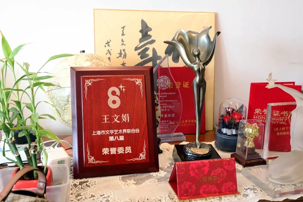王老师家沙发旁摆放着奖杯、荣誉证书,其中包括上海白玉兰戏剧表演艺术奖"终身成就奖"奖杯和上海市文学艺术界联合会第八届荣誉委员证书