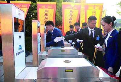 河南郑州黄帝故里拜祖大典上,来自40多个国家和地区的近万名嘉宾、工作人员和志愿者快速而有序地完成票证检验。智能人脸识别闸机设备能够快速验证人脸、身份证、票证信息。入场票证查检可以实现数据信息与公安指挥中心的实时交互。