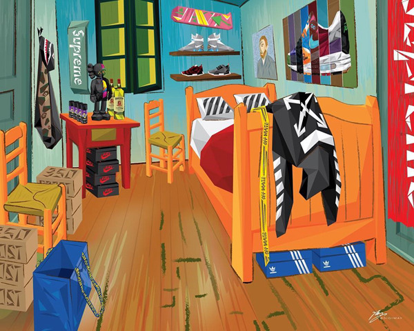 Digiway:这可能与时间旅行主题的电影有关,我总是会被时间旅行电影所打动、震惊到。我第一次想到把潮流和艺术结合这个创意是在《潮人梵高的卧室》这个作品。在看到原作《梵高在阿尔勒的卧室》时,我就在想,如果能够时间旅行,梵高的卧室如果是穿越到现代,会呈现出怎样有趣的布局呢?