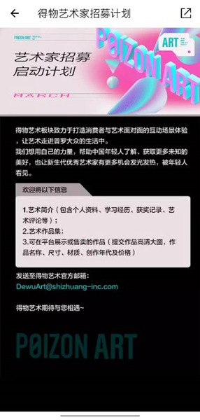 在上线“艺术”版块后,得物App在3月又发起了艺术家招募启动计划。此次计划致力于打造消费者与艺术面对面的互动场景体验。让艺术走进普罗大众的生活,让中国年轻人了解、获取更多未知的美好,也让更多新生代优秀艺术家有机会发光发热,被年轻人看见。