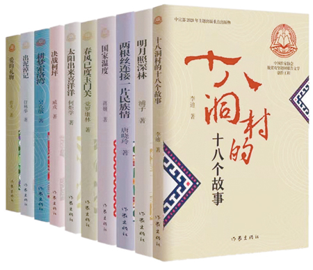 同许多聚焦一地一人脱贫攻坚情形的报告文学相区别,蒋巍的《国家温度》 ,是在全局视野和广阔范围内对全国很多地方扶贫脱困情形的书写。作家直抵云南、贵州、宁夏、新疆、陕西、黑龙江、上海等地,现场考察和观察感受各地在脱贫攻坚行动中的精神、作为和表现,在一次次的震撼和被贫困和反贫困的对象强烈地触动之后,蒋巍的泪点和激情被激活,他用对生活的本真发现与生动书写,像奔涌的河水,描绘了脱贫攻坚伟大行动中的“国家温度”,在全景的描绘中,为中国现实的脱贫攻坚的伟大行动留下了壮丽的诗章。十分值得关注的,还有由湖南教育出版社出版的《十村记:精准扶贫路》。这是由10部作品组成的一套书。由刘伟、纪红建任主编和副主编,分别由鲁顺民、刘先琴、杨丰美等18位作家,对习近平总书记曾亲自考察并做过重要指示的贫困村湖南十八洞村、江西神山村、陕西照金村、河北骆驼湾村、福建赤溪村、安徽大湾村、河南张庄村、贵州花茂村、山西赵家洼村、四川三河村的精准扶贫进程和成果给予专题性文学报告。作品结合这些村落的历史经济文化状况和时代背景,回溯其贫困的原因,聚焦几个人物或家庭的生活变迁,用平实的语言、生动形象的细节为例证,以点带面地展现了精准扶贫的非凡历程,有情怀温度、沾泥土、带露珠的新乡村故事,呈现了精准扶贫实施之后这些曾经的贫困地方发生的重大变化。这套作品,创意新颖,用力专注,内容丰富,很有精准扶贫道路的历史记录感。