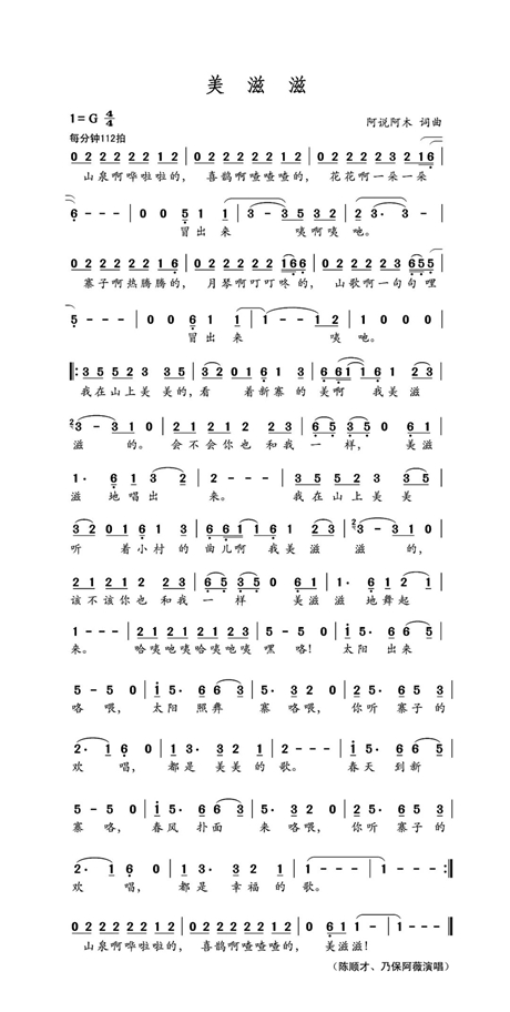 歌曲《美滋滋》采用男女声二重唱的形式,曲调融入了四川凉山彝族的传统民歌元素,并结合流行时尚化的配器手法,整体风格清新脱俗、独树一帜,使人印象深刻。两位彝族歌手情感真挚的演唱为作品增色不少,甜美的女声和温暖的男声一唱一和、配合默契,很好地为听众营造出一个“美滋滋”的氛围。