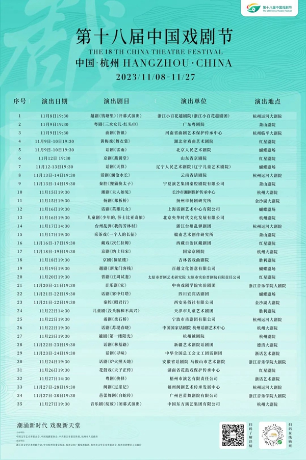 本届戏剧节持续至27日,将有来自全国省区市各级各类戏剧团体,涵盖京剧、秦腔、越剧、黄梅戏等15个戏曲剧种以及话剧、音乐剧、儿童剧、芭蕾舞剧等戏剧种类的34部参演剧目和1部特邀剧目在杭州上演。另有12部展演剧目在温州演出。
