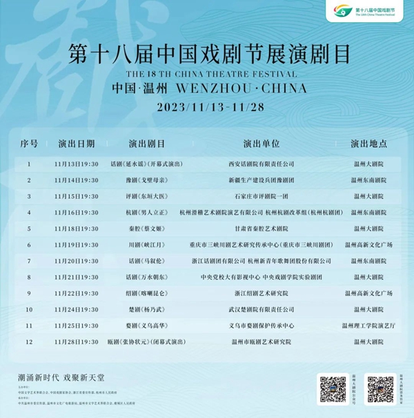 11月8日晚,由中国文联、中国剧协、浙江省委宣传部、杭州市人民政府主办的第十八届中国戏剧节在杭州市运河大剧院开幕。