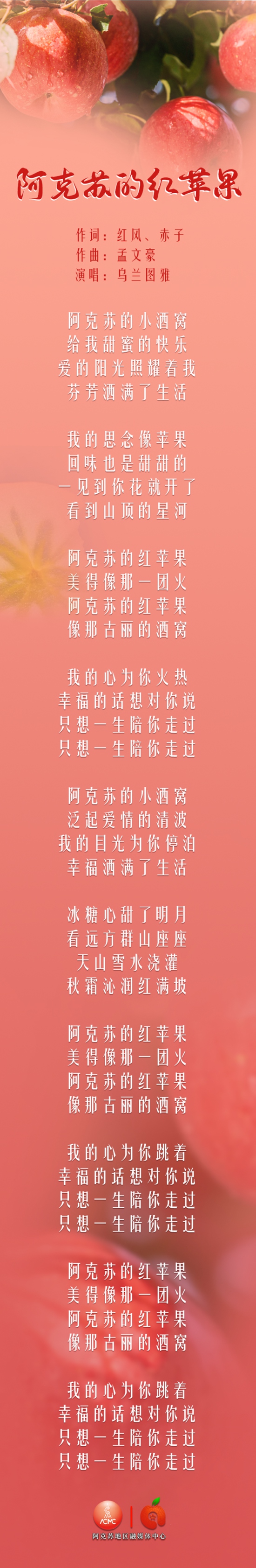 “阿克苏的小酒窝,给我甜蜜的快乐。爱的阳光照耀着我,芬芳洒满了生活……”《阿克苏的红苹果》由红风、赤子作词,孟文豪作曲,乌兰图雅演唱,是乌兰图雅与词曲作者共赴新疆采风后推出的一首原创歌曲。