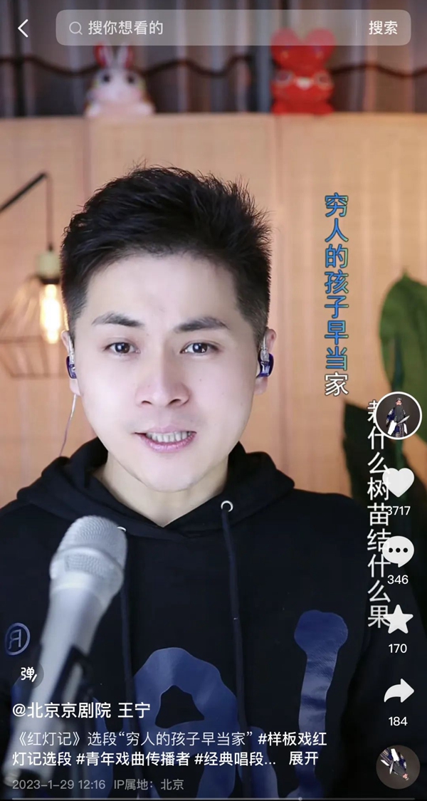 三年前,受到疫情影响,戏曲线下演出中断,北京京剧院老生演员、二级演员王宁和同事把抖音直播间当成练功房,经常一起对对戏、练练唱,为线下恢复演出作准备。随着传统文化类直播如雨后春笋一样涌现,王宁开始思考通过直播为京剧传承做点什么,“一些小众的、濒危的戏曲流派都面临着缺观众、缺人才、缺乏新的收入来源的困境,在抖音开播后我觉得找到了一种新的传承方式。”