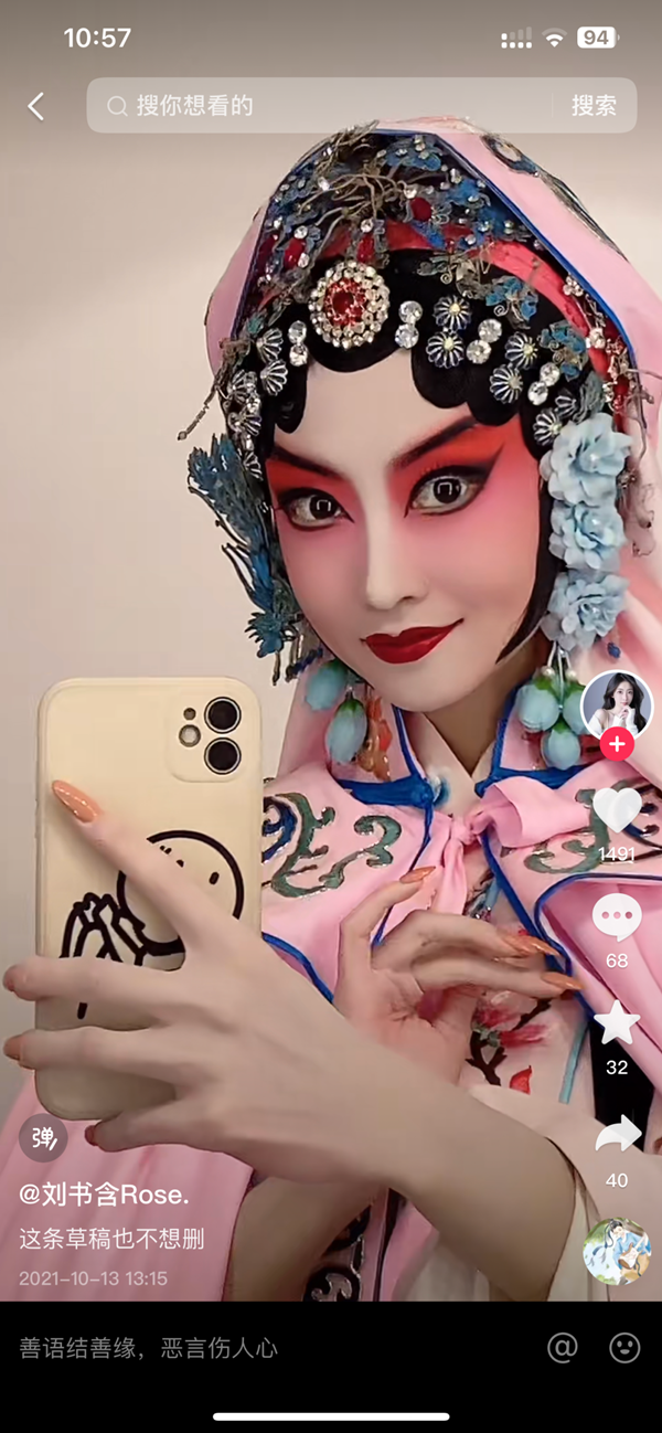 刘书含PK过的戏曲主播,也来自各个剧种和行当,有昆曲、越剧、川剧、豫剧、黄梅戏等。“他们的精彩表演给我带来了很多启发,一些主播在直播间为了更好的呈现效果,甚至是画好了戏妆、扮好了头面,服化道非常精良用心,在有限的镜头中最大程度去为观众表演,让观众通过镜头也能感受戏曲的博大精深。”和王宁一样,刘书含也在直播PK中学习到了不同剧种的演唱方式、表演形式,收获到宝贵的经验和成长。“对于戏曲传承,我们应该积极探索新的传播方式,利用短视频直播平台,扩大我们的戏曲传播范围,吸引更多年轻观众的关注。”