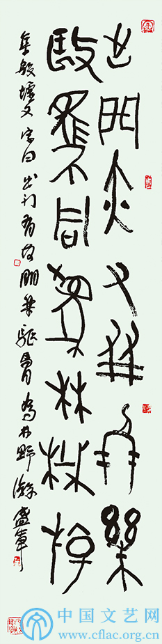 我的这件《出门驱马联》作品在技法上进行了综合,尝试一些突破,概括成一句话——追求书写性。没有对点画镌刻形态加以绝对模拟,在结体处理上借鉴一些金文,但篆法极力避免错讹,写出“地道的甲骨文”,结体保持奇纵之姿,大小疏密强烈对比,笔画有粗细和浓淡枯润的变化。虽然内在对比很多,但整个章法注重保持严密性,最突出最明显就是上下平齐。